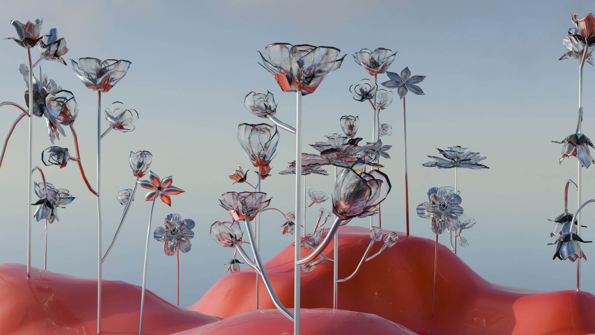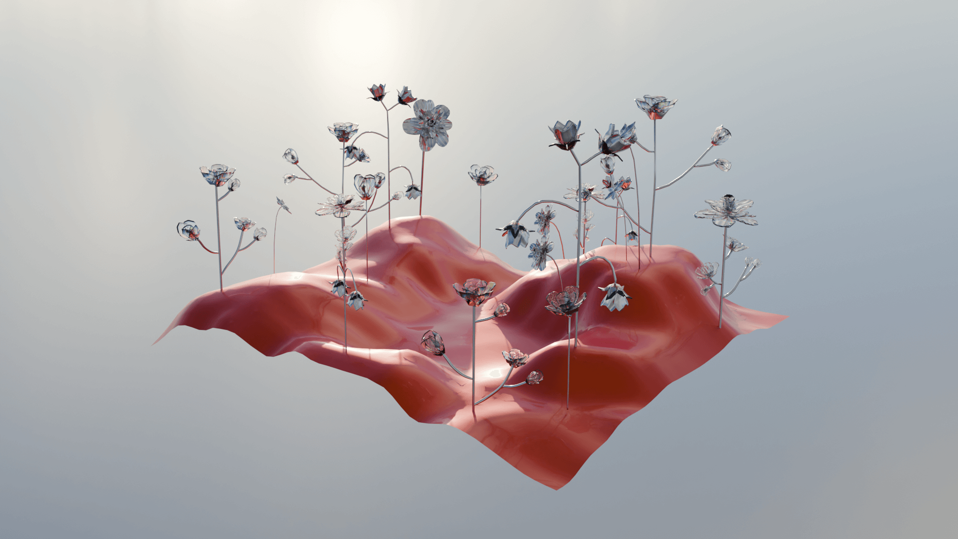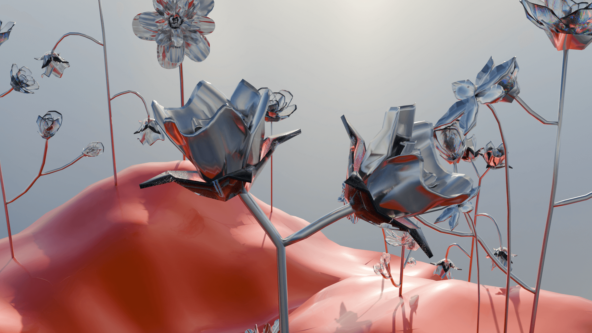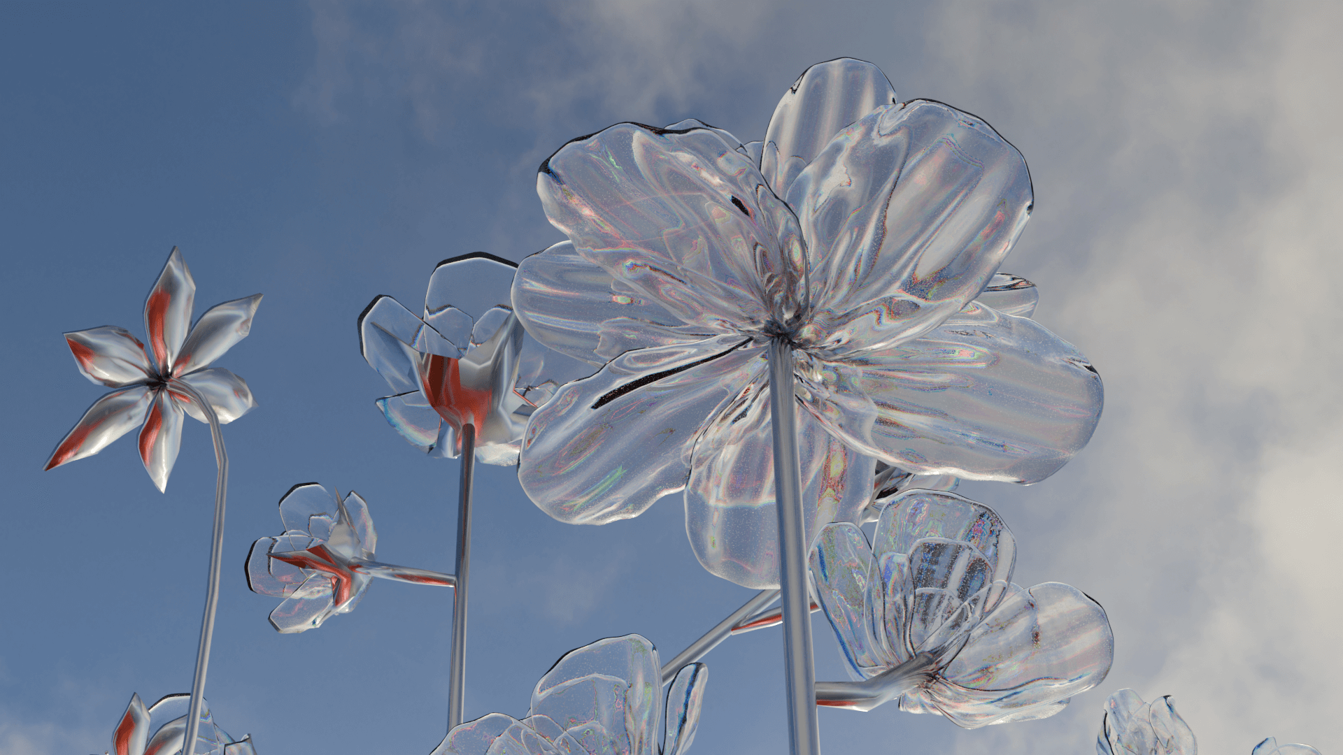 This project is a 3D environment I created and animated in Blender. It features glass- and chrome-like flowers arranged in a reflective, soft-shaped landscape. All materials were built using custom node setups, and every element of the scene — from models to lighting to animation — was constructed manually. The work focuses on form, surface, and atmosphere, exploring how light interacts with translucent and metallic structures.